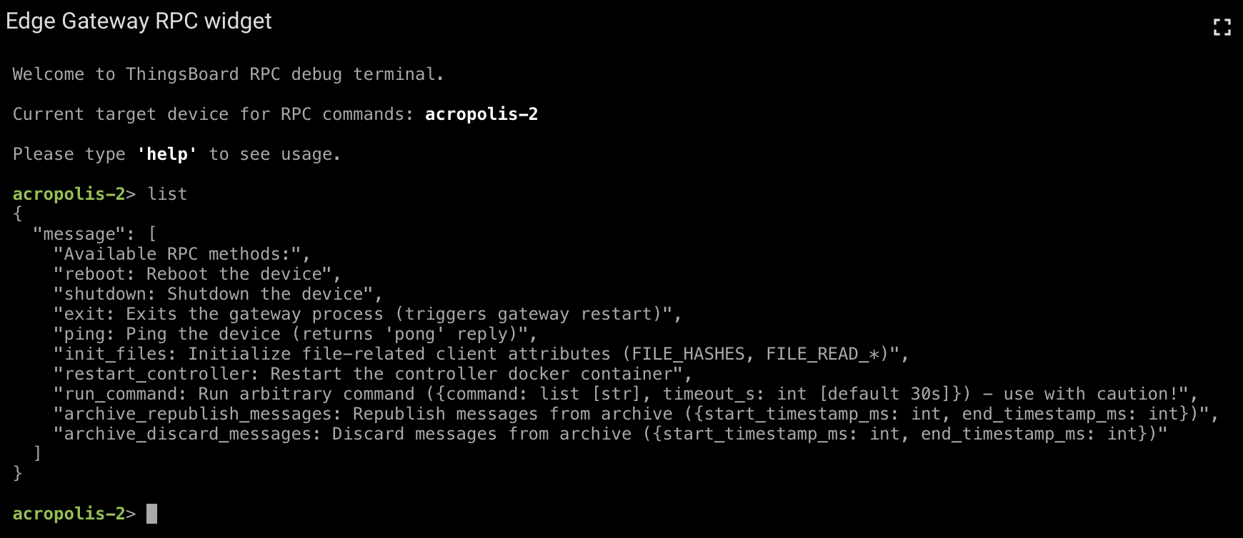 ThingsBoard provides an RPC widget that acts as an interactive console within dashboards. Using this widget, users can send RPC requests to a specific TEG gateway device and inspect the returned responses in real time.
